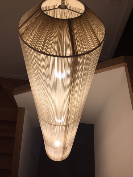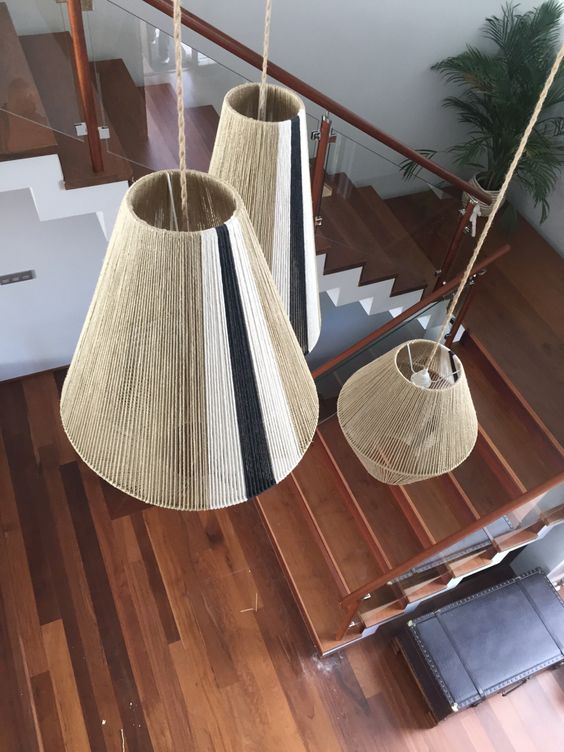 Uno de los proyectos era proponer un grupo de lamparas para el hueco de una escalera en una casa al lado de la playa en el municipio de Oleiros-La Coruña. La propietaria de la casa quería que las lamparas tuviesen toques de color que combinasen con los tonos la madera de la barandilla y las escaleras, de la zona en la que íbamos a instalar las lámparas. Propuse hacer SARANELLA- SA CONCA Y BARCELONETA XXL en cordón de algodón orgánico crudo grueso, con un grupo de franjas en contraste en tonos naturales.