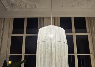 Cuando hablamos, su premisa fue muy clara, quería que le hiciera una lámpara en un tejido muy fino y transparente. Nos escribimos muchos emails, intercambiamos muchas ideas, hice varias pruebas de tejido, le envié muchas fotografiás y al fin salió un prototipo, un presupuesto y finalmente una lámpara que lleva el nombre de su ciudad, pues así es, todas mis lámparas se llaman o como la ciudad en la que se instala la primera, o si hay una playa allí mismo o cerca, entonces, su nombre es el de la playa.