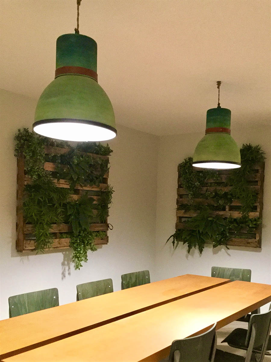 Mueble en madera color natural, hierro oxidado y tiradores en cuero, hecho a mano, para la zona del comedor de la planta superior del restaurante. Lámparas vintage estlo industrial, recuperadas y customizadas con pintura degradada en tonos verdes y cuero natural. Murales de pared con plantas sintéticas para la zona del reservado.